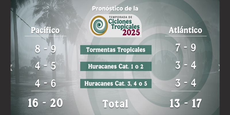 De acuerdo al pronóstico de la “Temporada de Ciclones Tropicales 2025” en el Pacífico, se estima la formación de entre 16 y 20 ciclones tropicales, indicó el maestro en ciencias, Jesús Miguel Corrales Sauceda, responsable de laEstación Climatológica de la Facultad de Biología dela Universidad Autónoma de Sinaloa (UAS), el Servicio Meteorológico Nacional (SMN) dependiente de la Comisión Nacional del Agua (CONAGUA).