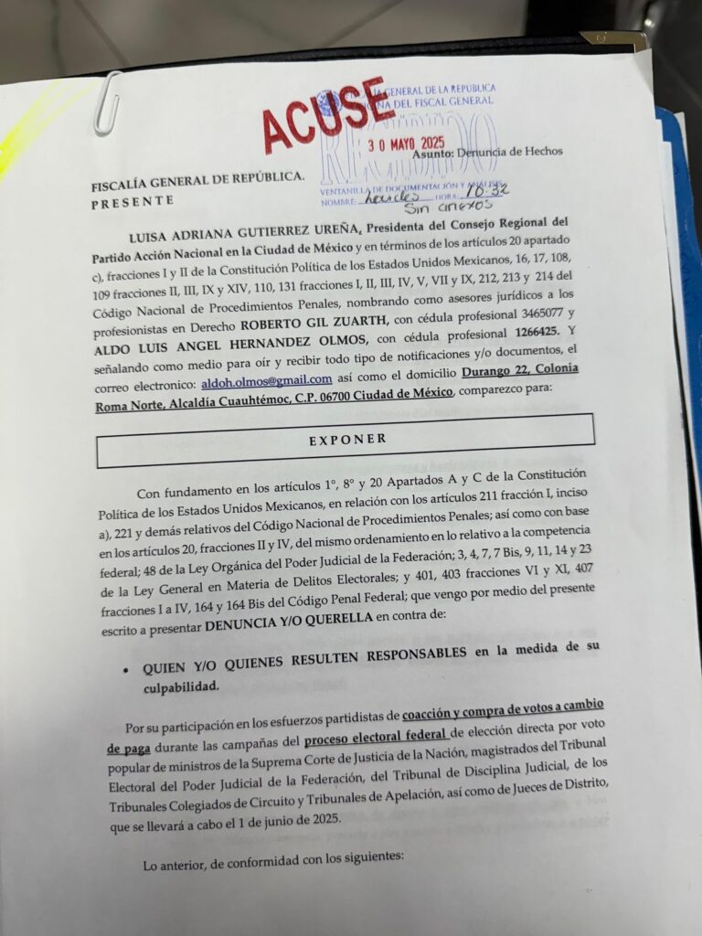 PAN formalizó denuncia contra GCDMX y Morena por manipular, coaccionar y desviar recursos para elección al Poder Judicial