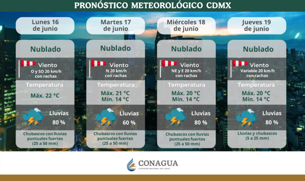 Cielo nublado con lluvias durante la mayor parte del día, con probabilidad de lluvias puntuales fuertes en la Ciudad de México y puntuales muy fuertes en el Estado de México, acompañadas con posibles descargas eléctricas.
