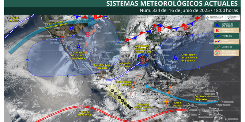 Indicó que para hoy, el potencial ciclón tropical Cinco-E o posible tormenta tropical Erik se localizará al sur de las costas de Chiapas, interaccionará con un canal de baja presión en el sureste del país, con la aproximación de una onda tropical y con la entrada de humedad del mar caribe, originando lluvias fuertes a puntuales muy fuertes en la región mencionada, además de la península de Yucatán, pronosticándose lluvias puntuales intensas en regiones de Guerrero, Oaxaca, Chiapas y Veracruz, así como rachas de viento y oleaje elevado en las costas del sur y sureste del territorio nacional.