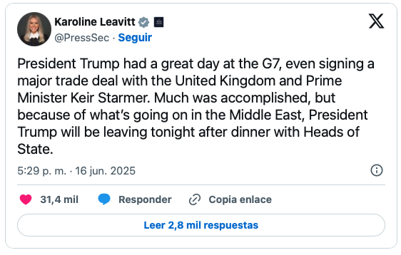 Leavitt señaló en sus declaraciones que, a pesar de la salida anticipada, Trump considera que ha logrado avances significativos durante su participación en la cumbre, destacando un acuerdo comercial importante firmado con el Reino Unido. Sin embargo, la situación de inseguridad en Oriente Medio ha llevado al presidente a regresar rápidamente a su país.