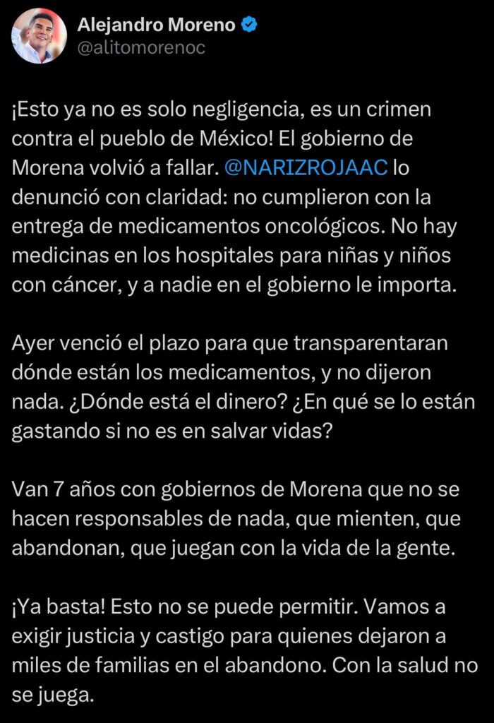 El presidente del Comité Ejecutivo Nacional (CEN) del Partido Revolucionario Institucional (PRI), Alejandro Moreno, denunció la negligencia del gobierno federal de Morena al no abastecer de medicamentos a los niños con cáncer y calificó su falta como un crimen contra el pueblo de México.