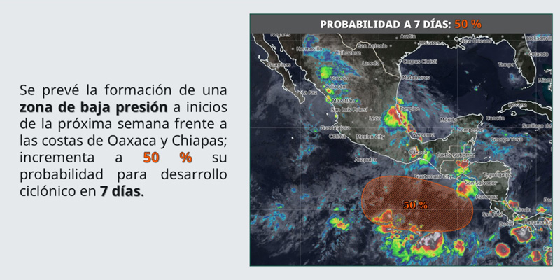 Para el inicio de la próxima semana el SMN prevé la formación de una zona de baja presión con 50% de probabilidades para desarrollar un ciclón tropical frente a las costas de Oaxaca y Chiapas en el océano Pacífico.