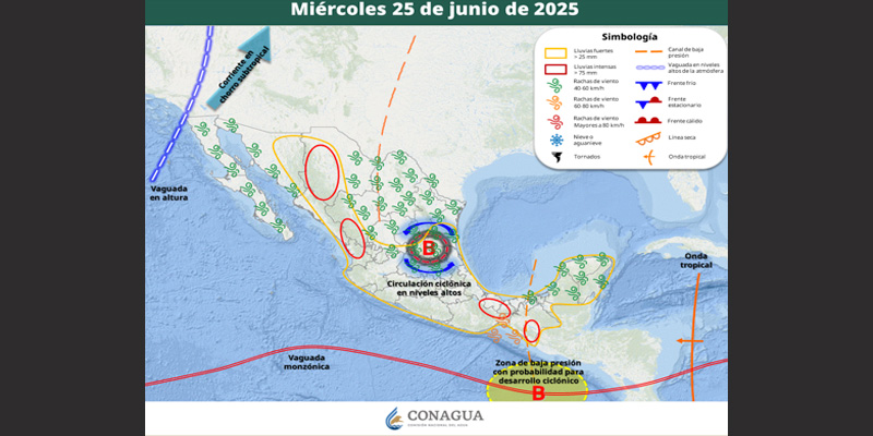 Canales de baja presión sobre la Mesa del Norte, la Mesa Central, el noreste y oriente de la República Mexicana, en interacción con una circulación ciclónica en altura, divergencia y el ingreso de humedad del océano Pacífico y golfo de México, propiciarán chubascos y lluvias fuertes a muy fuertes acompañadas de descargas eléctricas en dichas regiones, pronosticándose lluvias puntuales intensas en Nayarit, Jalisco, Colima y Michoacán.