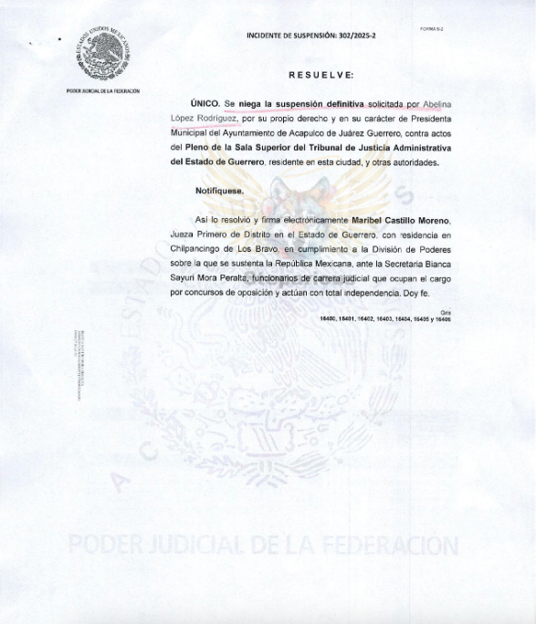 En audiencia pública celebrada el jueves, en seguimiento a la promoción del juicio de amparo indirecto 302/2005-2, presentada por Abelina López Rodríguez “contra actos del Pleno de la Sala Superior del Tribunal de Justicia Administrativa del Estado de Guerrero (TJAGro)”, la jueza primero de Distrito del Estado de Guerrero, Maribel Castillo Moreno, dictaminó negar la “suspensión definitiva solicitada por (la alcaldesa de Acapulco)”, porque “hacerlo implicaría paralizar el procedimiento de origen”, y porque según el artículo 150 de la Ley de Amparo, uno de los requisitos para hacer válida una petición como la hecha por Abelina López es que «no (se) impida la continuación del procedimiento en el asunto que haya motivado el acto reclamado”, en este caso, el esclarecimiento de la aplicación de los 898 millones de pesos que Abelina López se niega y resiste aclarar.