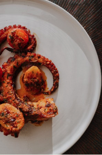 Para deleitar a los sibaritas, La Bóveda ha incorporado un menú de degustación en el que se realiza un recorrido por sus platillos más emblemáticos. Compuesto por cinco tiempos, combina recetas de temporada, como la pesca del día zarandeada con pico de gallo y los raviolis de cangrejo moro con mantequilla de limón y un maridaje a partir de vinos mexicanos, franceses, cervezas artesanales y mezcal oaxaqueño.