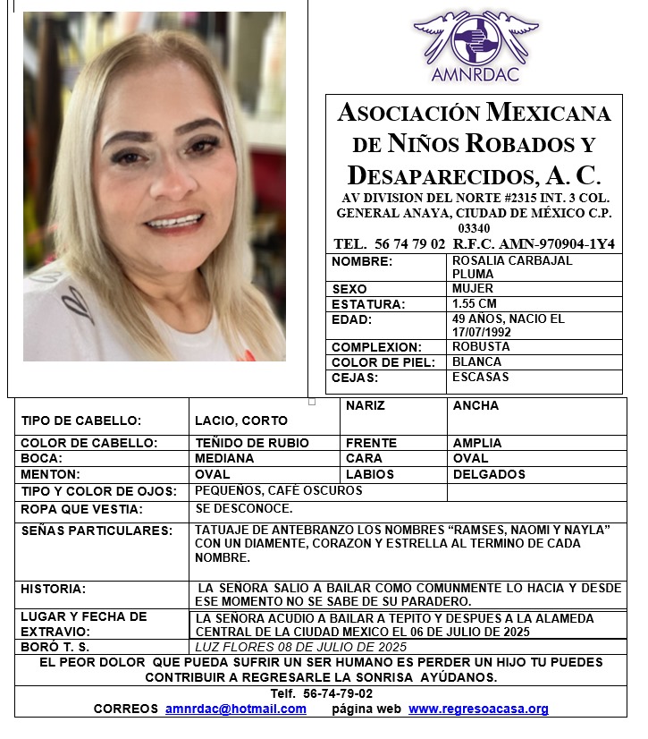 Se trata de Rosalia Carbajal Pluma de 49 años de edad, misma que salió de su hogar el pasado domingo 6 de julio y no regresó a casa.