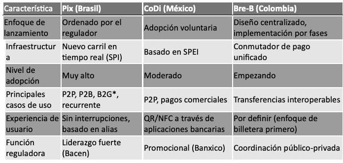 CoDi de México adopta un objetivo similar de inclusión financiera en tiempo real, pero ha adoptado un enfoque diferente. Construido sobre la infraestructura existente del Sistema de Pago Electrónico Interbancario (SPEI) del país y encabezado por el Banco de México, CoDi permite pagos con código QR y NFC. A diferencia de Pix, CoDi se basa en la adopción voluntaria impulsada por los bancos y se enfoca en la incorporación de comercios.