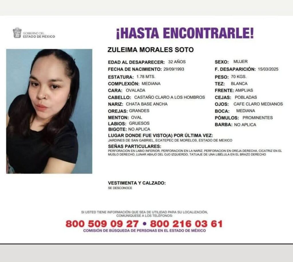 Zuleima Morales Soto, de 32 años, desapareció el pasado 15 de marzo del presente año, en la colonia Jardines de San Gabriel, en el municipio de Ecatepec, Estado de México.