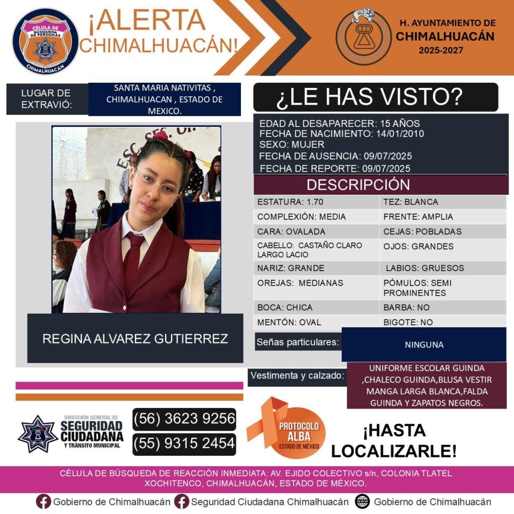 Regina Álvarez Gutiérrez, de 15 años, desapareció este miércoles 9 de julio en la colonia Santa María Nativitas, en el municipio de Chimalhuacán, Estado de México.
