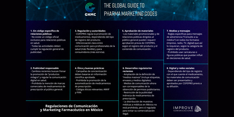 En el caso de México, la guía destaca que el país no cuenta con un código oficial específico para relaciones públicas en el sector farmacéutico. Por ello, todas las actividades de comunicación deben regirse por la normativa vigente en materia de publicidad, la cual ha experimentado cambios significativos en los últimos años para combatir la proliferación de productos “milagro” y regular la publicidad digital en salud.