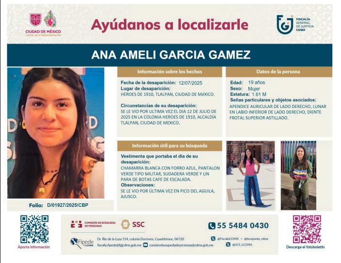 Ana Ameli García Gámez, de 19 años, desapareció este 12 de julio en la colonia Héroes de 1910, de la alcaldía Tlalpan, en la Ciudad de México.