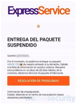 ExpressService: en este caso, los actores maliciosos utilizan el nombre de una supuesta empresa de mensajería llamada “Express Service”, y apelan al sentido de la urgencia, con una supuesta entrega de paquete que se encuentra suspendida. Al hacer clic en el botón para supuestamente resolver el problema, el usuario es llevado a un formulario apócrifo donde los datos que ingresen serán solo para los cibercriminales.
