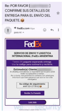 FedEx: otro ejemplo es el que suplanta la identidad de FedEx, pidiéndole a la posible víctima que confirme sus datos para que el supuesto paquete sea enviado.