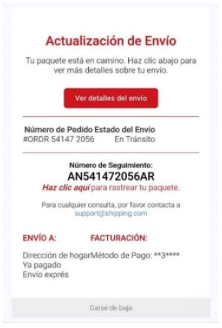 Empresas de shipping: otro señuelo muy utilizado es el de una supuesta actualización del envío. Allí, insta a las personas a ver los detalles, para conocer el estado de la entrega.