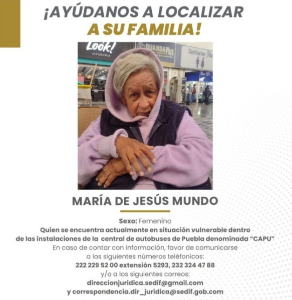 En tanto, otros indican que ella dijo, mientras derramaba lágrimas, que esperaba a su hija, por lo que en algún momento la dirección jurídica del DIF Puebla realizó un cartel con su foto, donde se informaba de su presencia en la CAPU, por si alguien tenía información de su familia o la hija que esperaba miraba el cartel.