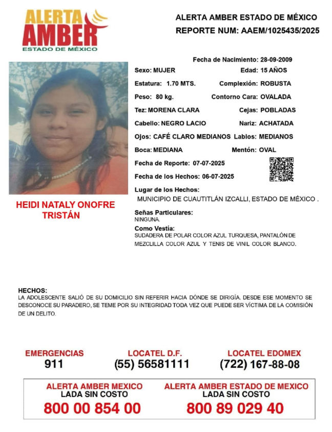 Heidi Nataly Onofre Tristán, de 15 años, desapareció el 6 de julio de 2025, en el municipio de Cuautitlán Izcalli, Estado de México.