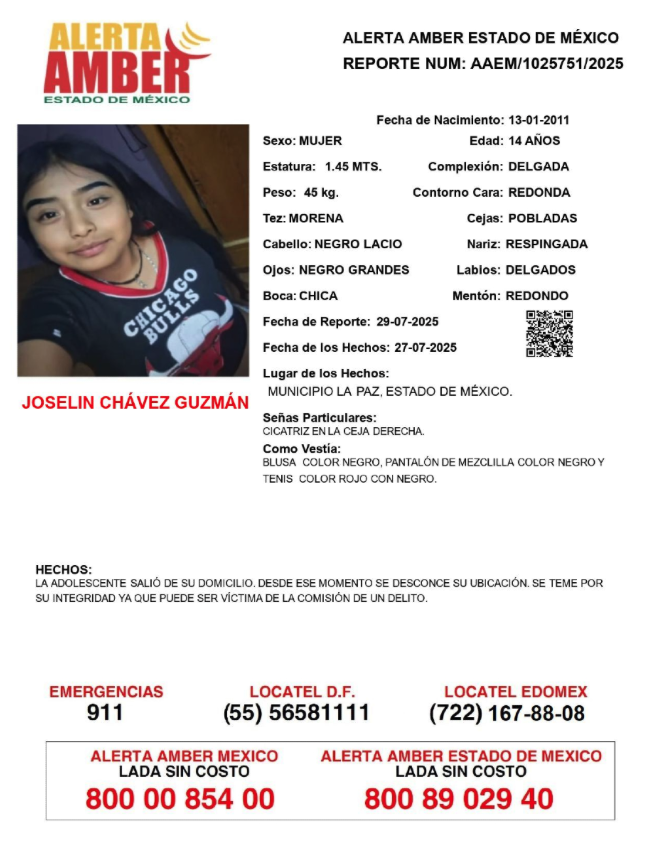 Joselin Chávez Guzmán, de 14 años, desapareció el 27 de julio en el municipio La Paz, Estado de México.