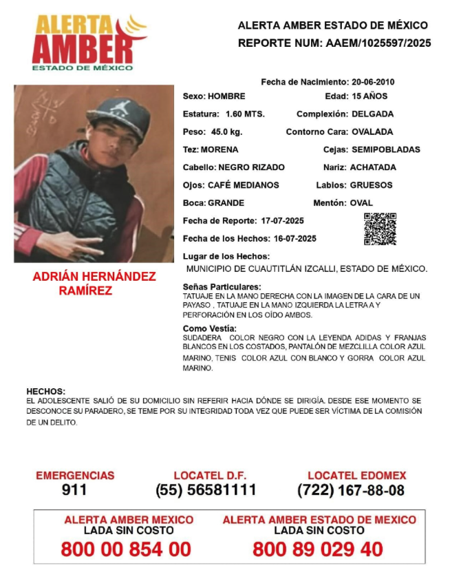 Adrián Hernández Ramírez, de 15 años, desapareció el 16 de julio de 2025, en el municipio de Cuautitlán Izcalli, Estado de México.