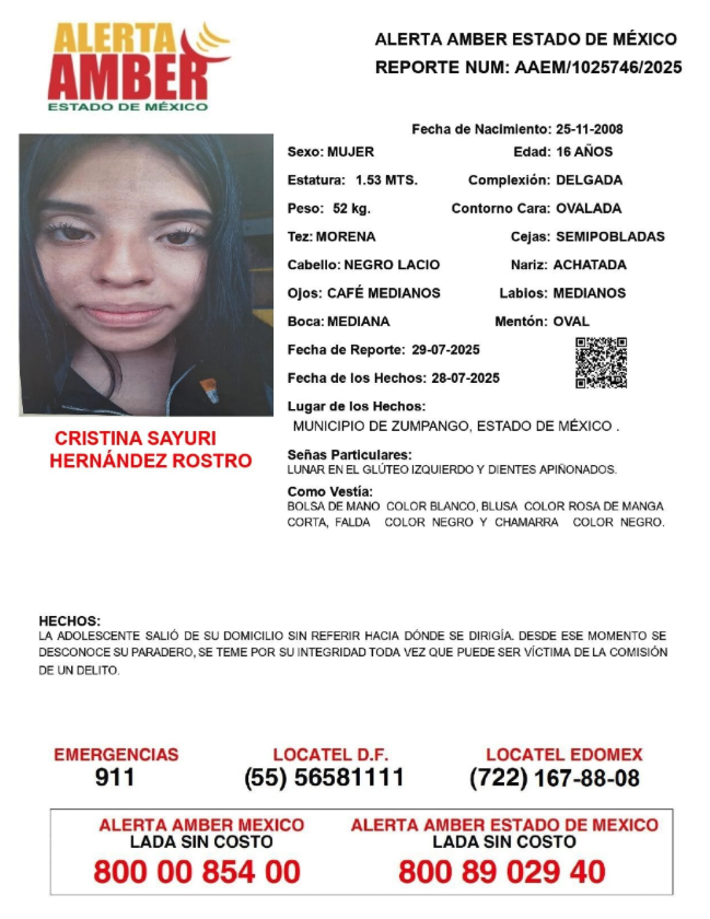 Cristina Sayuri Hernández Rostro, de 16 años, desapareció el 28 de julio de 2025, en el municipio de Zumpango, Estado de México
