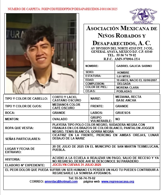 Gabriel Galicia Sabino, de 18 años, desapareció el 20 de julio de 2025, cuando se dirigió a la escuela ubicada en San Martín Texmelucan, Puebla.