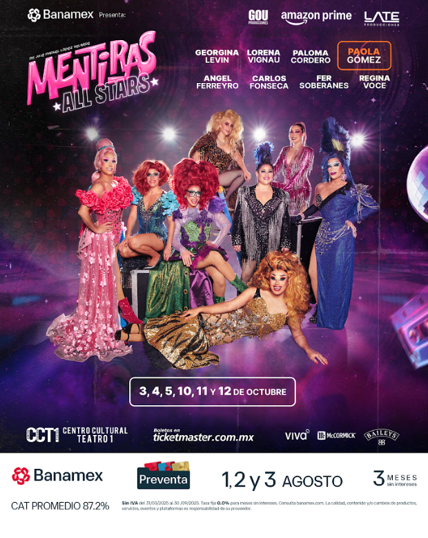 Mentiras All Stars reúne a lo mejor del elenco que ha dado vida a este fenómeno teatral durante más de una década, en funciones especiales que celebran la música, la emoción y los enredos que solo esta historia puede ofrecer.