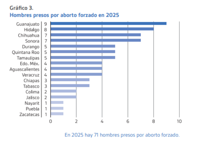 Al respecto, el reporte de UNNA indica que, en 2024, 38 hombres estaban encarcelados por aborto forzado. Esta cifra aumentó a 71 en 2025. Guanajuato, Hidalgo, Chihuahua y Sonora muestran las cifras más altas en lo que va del año.