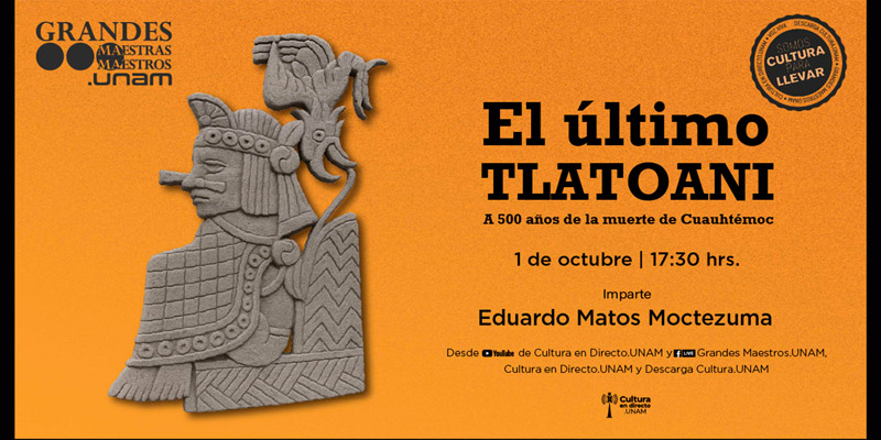 A 500 años de la muerte de Cuauhtémoc, el último tlatoani mexica, el reconocido arqueólogo e investigador Eduardo Matos Moctezuma, miembro de El Colegio Nacional, ofrecerá una charla donde recorrerá la vida y legado del líder mexica, así como los acontecimientos que llevaron a su trágico final durante el periodo inicial de la Conquista. Esta actividad forma parte del programa Grandes Maestros. UNAM y será transmitida en vivo por el canal de YouTube Cultura en Directo. UNAM, con acceso libre y gratuito, hoy 1 de octubre a partir de las 17:30 horas.