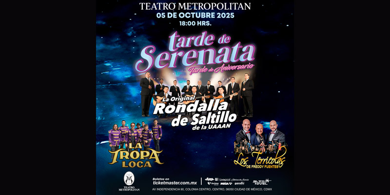 Esta “Tarde de Serenata” será más que un concierto: será una celebración del amor expuesto en acordes, del relato musical que no envejece, del recuerdo que encuentra su voz en la melodía. Una tarde donde el romance mexicano será enaltecido con ternura y vigor, donde las canciones volverán a ser confesiones hechas canción, y donde el Teatro Metropólitan se convertirá en el templo acústico del sentimiento colectivo. El 5 de octubre, quienes se sientan ahí lo sabrán: asistirán no solo a un show, sino a continuación de su propia historia sentimental, tejida en notas y armonías compartidas. Boletos a la venta en el Sistema Ticketmaster y en taquillas del inmueble.