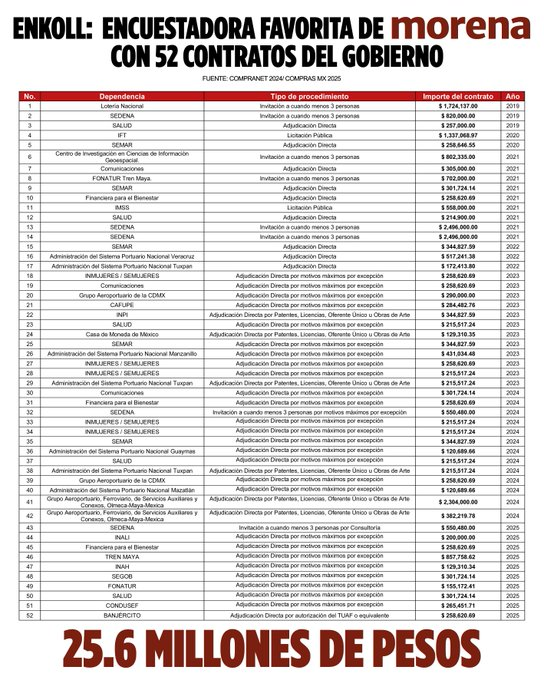 • Denuncia que ENKOLL, la casa encuestadora de Morena, ha recibido contratos millonarios de dependencias federales, por un monto estimado de 25,6 millones de pesos, para difundir encuestas favorables