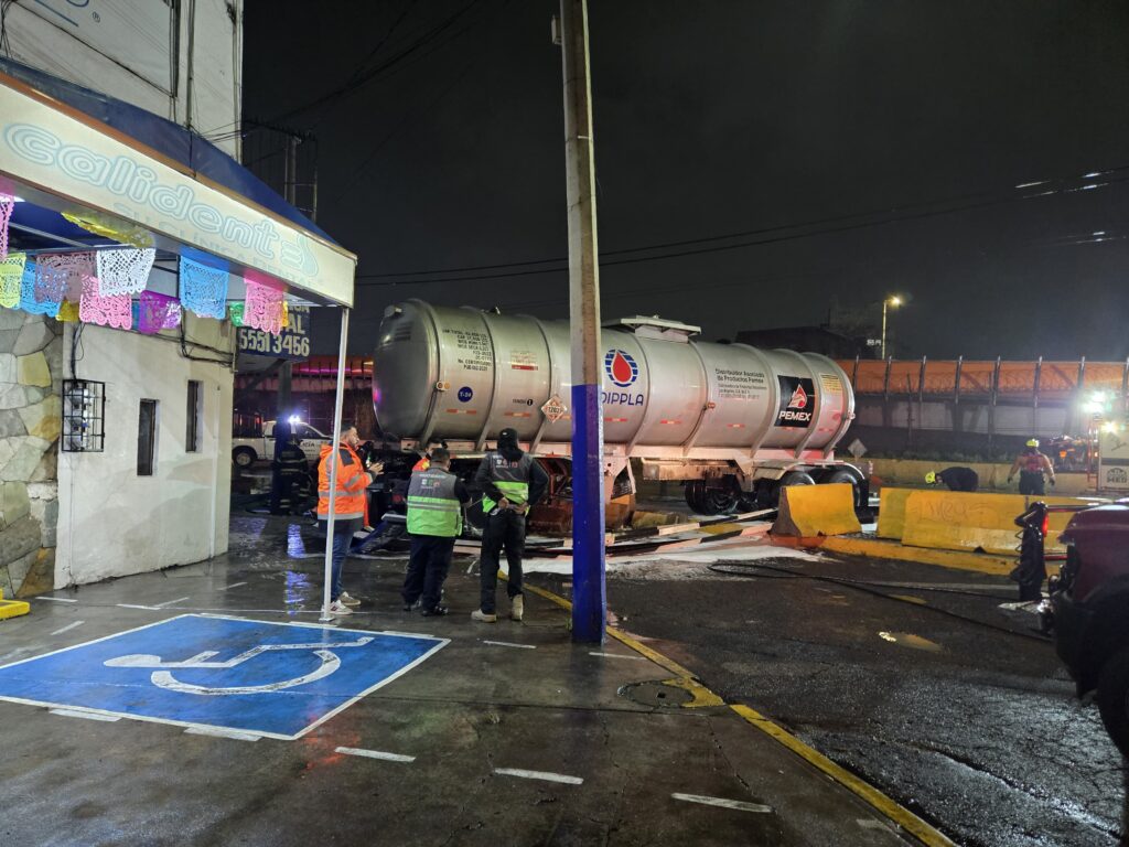Pipa de doble remolque con logotipo de PEMEX chocó contra muro de contención cerca Metro Oceanía