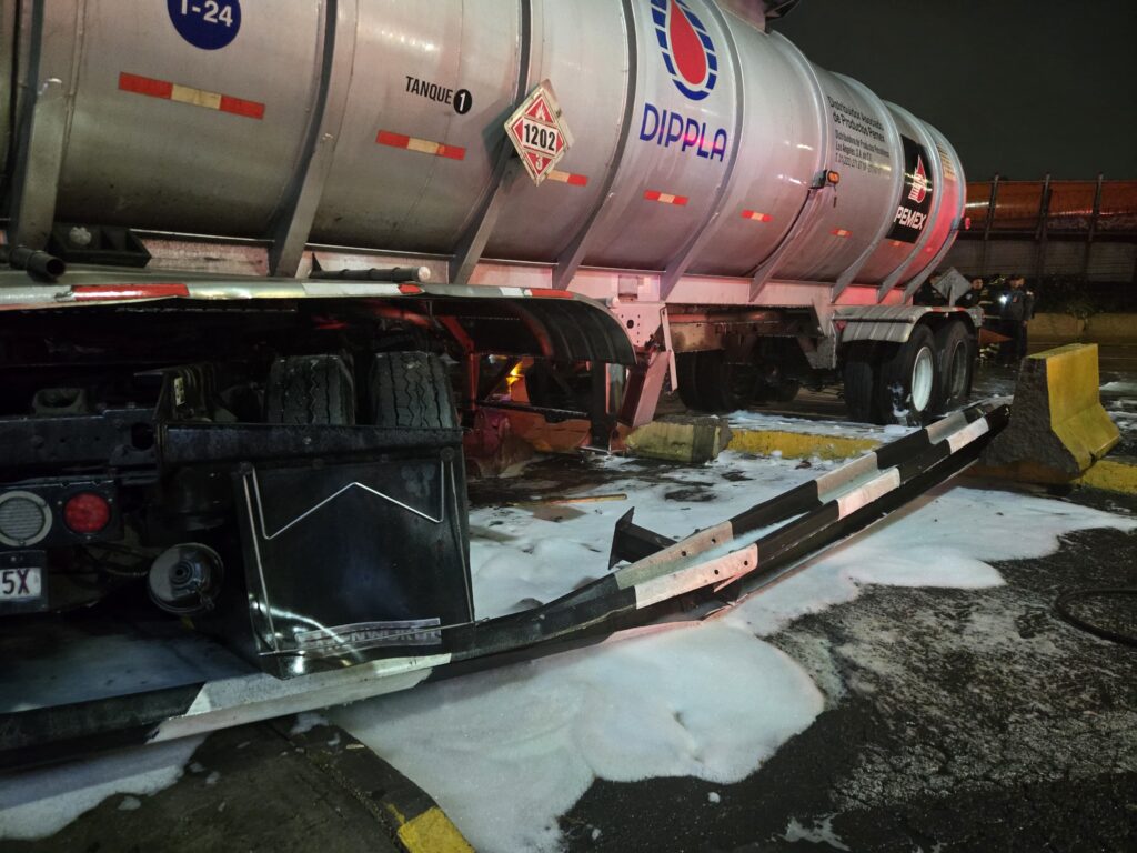 A la pipa tractor marca Kenworth, modelo 2019, de doble contendor de la Compañía Productos Petrolificos Los Ángeles, con logotipo de PEMEX, placas de circulación 60AH5X y de los contenedores 24UA8T y 25UA8T, se le derramó el combustible que transportaba en el tanque de carburación con capacidad de 200 litros.