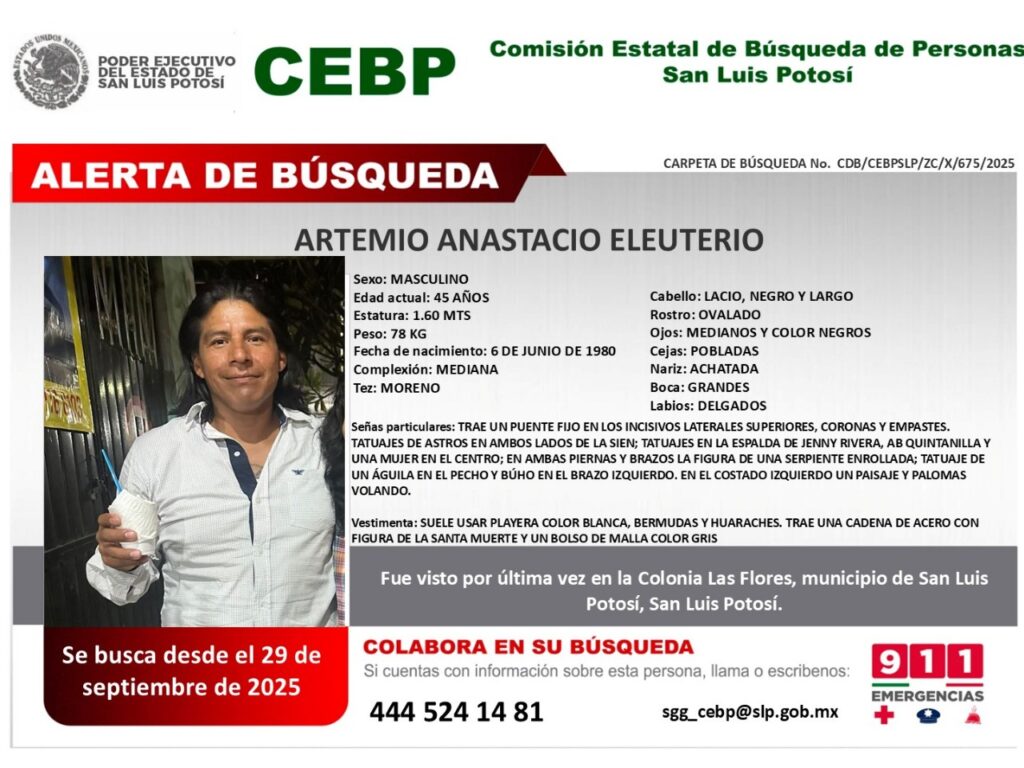 Artemio Anastacio Eleuterio, de 45 años, desapareció el pasado 29 de septiembre de 2025, en la colonia Las Flores, en el municipio de San Luis potosí, San Luis Potosí.