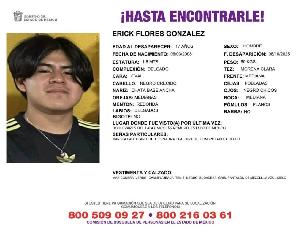 Erick Flores González, de 17 años, desapareció este 8 de octubre, en Boulevares del Lago en el municipio de Nicolás Romero, Estado de México.