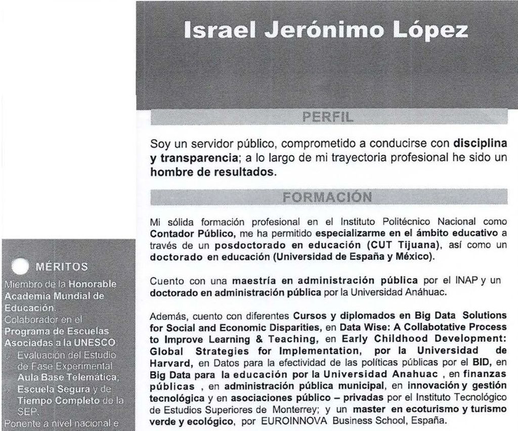 En su Constancia de Situación Profesional, Jerónimo López aparece con un grado de Maestría fechado en 2002 y un grado de Licenciatura en 2004, un orden cronológicamente imposible y, a pesar de ello, el funcionario que también fue subsecretario de Educación Media Superior en el Estado de México, ha mantenido ambos títulos como válidos y simultáneos, sin que la SEP haya iniciado investigación alguna por estas irregularidades.