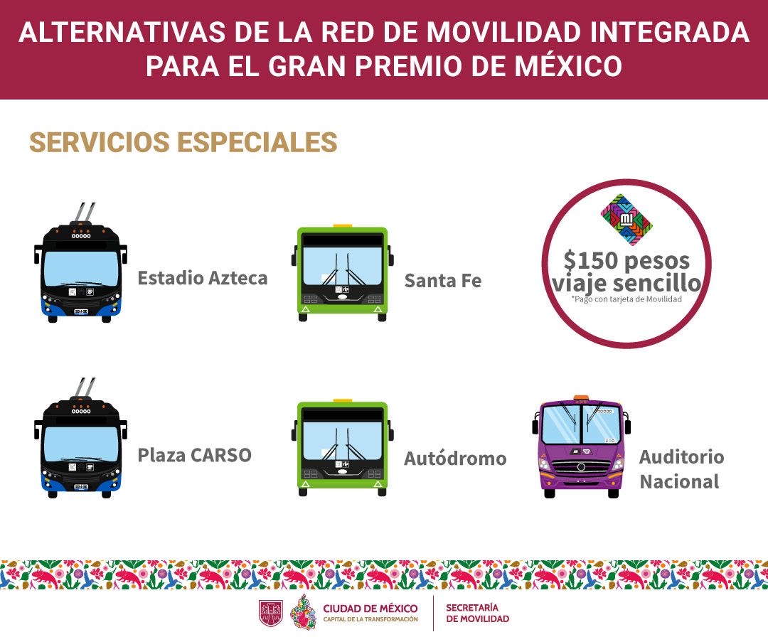En el marco del Gran Premio de México que se realizará del 24 al 26 de octubre en la capital, la Secretaría de Movilidad (SEMOVI) informa los servicios especiales que ofrecerá la Red de Movilidad Integrada, para apoyar a las personas que acudan a este importante evento deportivo.