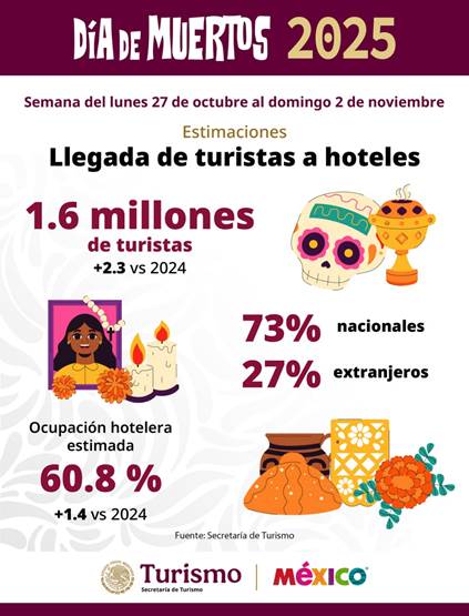 Al resaltar que estas cifras confirman la fortaleza del turismo cultural en México, impulsado por celebraciones únicas como el Día de Muertos, añadió que la ocupación hotelera promedio durante la semana se prevé en 60.8 por ciento, 1.4 puntos porcentuales más que en 2024.