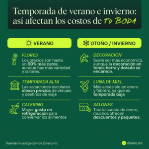 “Casarse en verano tiene varios factores que podrían encarecer el costo de una boda, aunque el clima es mucho más agradable, es considerada una temporada alta para la contratación de salones y viajes de luna de miel. Por el lado contrario, mediados y finales de invierno, pueden traer consigo promociones y descuentos tanto en el evento como en el viaje de bodas”, puntualizó Alejandro Sena, de Dinero.mx