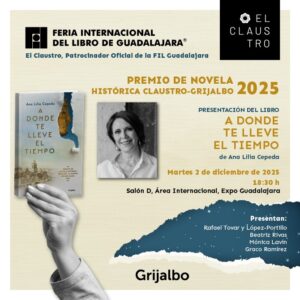 Entre las actividades que El Claustro realizará en la FIL Guadalajara está la presentación de la novela A dónde te lleve el tiempo, de Ana Lilia Cepeda, obra ganadora del IV Premio de Novela Histórica Claustro- Grijalbo, en un acto a celebrarse el martes 2 de diciembre, a las 18:30 horas, en el Salón D, Área Internacional, Expo Guadalajara. Participarán el rector de la UCSJ, doctor Rafael Tovar López-Portillo, Beatriz Rivas, Mónica Lavín y Graco Ramírez.