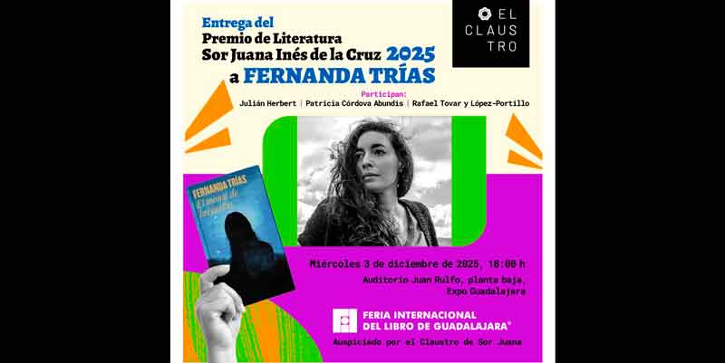 El miércoles 3 de diciembre, a las 18:00 horas, en el Auditorio Juan Rulfo, planta baja, Expo Guadalajara, se realizará la entrega del Premio de Literatura Sor Juana Inés de la Cruz 2025 a Fernanda Trías, se contará con la participación de Julián Herbert, Patricia Córdova Abundis y del doctor Rafael Tovar López-Portillo, rector de la Universidad del Claustro de Sor Juana, patrocinadora oficial de dicho galardón.