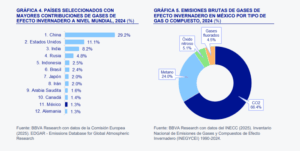 A nivel mundial, México se encuentra en el lugar 11 entre los países que más emiten gases de efecto invernadero a la atmósfera, según un reporte dado a conocer este 15 de diciembre de 2025 por el área de Estudios Económicos de BBVA México.