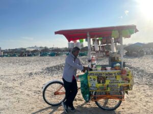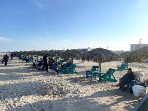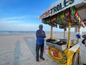 El sol cada vez se sentía más caliente. La playa se iba llenando de familias que llegaban para disfrutar del feriado con con pelotas y papalotes. También llegaban los vendedores de elotes asados con mayonesa, limón y chile aportando un aroma particular. Los algodones azules y rosas se veían tan ligeros que parecía que volaban. La playa parecía la paleta de un pintor que pintaba un arcoíris de colores. El salvavidas con su silbato colgado al cuello tomaba su puesto de vigilante en un silla alta.
