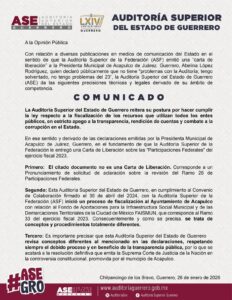 La ASE informó que, en cumplimiento al Convenio de Colaboración firmado el 30 de abril de 2024 con la ASF, inició un proceso de fiscalización al Ayuntamiento de Acapulco respecto al Fondo de Aportaciones para la Infraestructura Social Municipal (FAISMUN), correspondiente al Ramo 33 del ejercicio fiscal 2023.