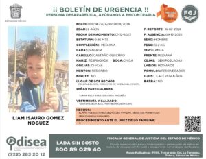 La Fiscalía General de Justicia del Estado de México (FGJEM) emitió una cédula de búsqueda para localizar a Liam Isauro Gómez Noguez, de 2 años, quien fue sustraído de su hogar el 9 de diciembre de 2025, en la colonia El Sol, municipio de Nezahualcóyotl, Estado de México.