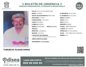 La Fiscalía General de Justicia del Estado de México (FGJEM) emitió una cédula de búsqueda para localizar a Tiburcio Olguín Dimas, de 59 años, quien desapareció el 20 de octubre de 2025 en la colonia Centro del municipio de Polotitlán, en el Estado de México.
