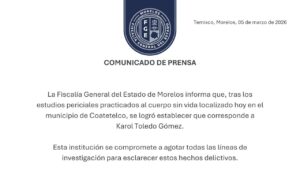 Ayer, la Fiscalía General del Estado confirmó que el cuerpo localizado este miércoles, en el municipio de Coatetelco, es el de Karol Toledo, joven de 18 años, estudiante de la Licenciatura en Derecho de la UAEM.