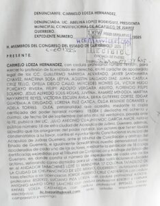 Carmelo Loeza Hernández, representante legal de los trabajadores demandantes, informó que presentó una solicitud formal de juicio político contra Abelina López, por presunto manejo irregular de recursos públicos.
