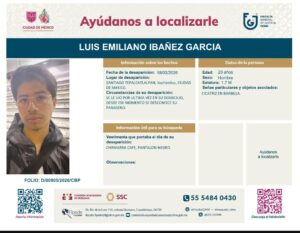 La Fiscalía General de Justicia de la Ciudad de México (FGJCDMX) emitió una cédula de búsqueda para localizar a Luis Emiliano Ibáñez García, de 20 años, quien desapareció este 18 de marzo del presente año en Santiago Tepalcatlalpan, de la alcaldía Xochimilco en la Ciudad de México.