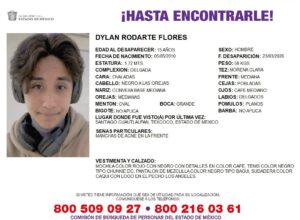 La Fiscalía General de Justicia del Estado de México (FGJEM) emitió una cédula de búsqueda para localizar a Dylan Rodarte Flores, de 15 años, quien desapareció el 23 de marzo del presente año, en Santiago Cuautlalpan, en el municipio de Texcoco, Estado de México.