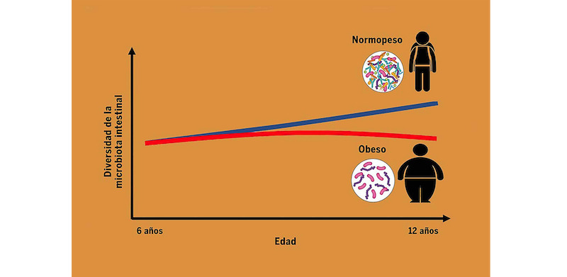 Si pudiéramos sacar fotografías de la colonización del tracto gastrointestinal de un neonato en condiciones sanas, veríamos que ciertos grupos bacterianos llegan en determinadas cantidades y tiempo, y que esta trayectoria de colonización se rompe drásticamente en quienes tienen obesidad, detalló.